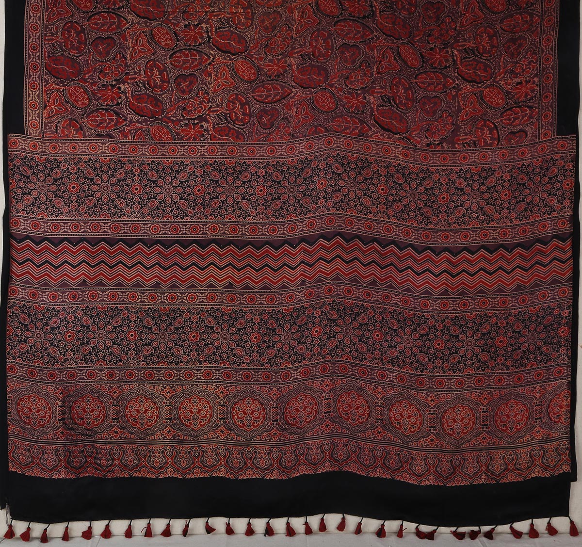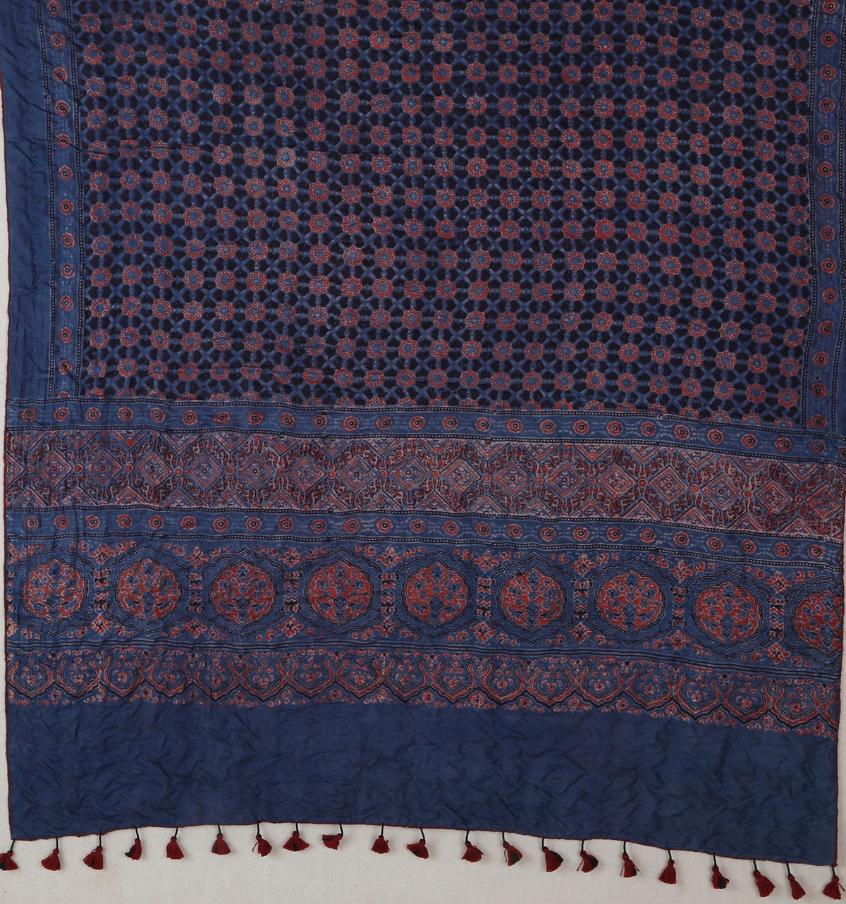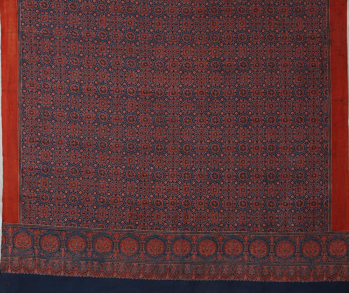 It is practiced in three clusters – Dhamadka, Khavada in Kutch , Barmer in Rajasthan and Sindh, Pakistan. Here in Kutch, it has been mostly practiced by the Khatri community for over 9 generations and now the Harijan communities who were earlier workers with the Khatiris have gone on to being entrepreneurs. This printing technique uses wooden blocks for resist printing, where patterns are blocked with mud or lime. The preparation and printing techniques are lengthy, demanding and highly technical. Traditionally Ajarkh fabric was used by men as lungis and as safas (turbans).