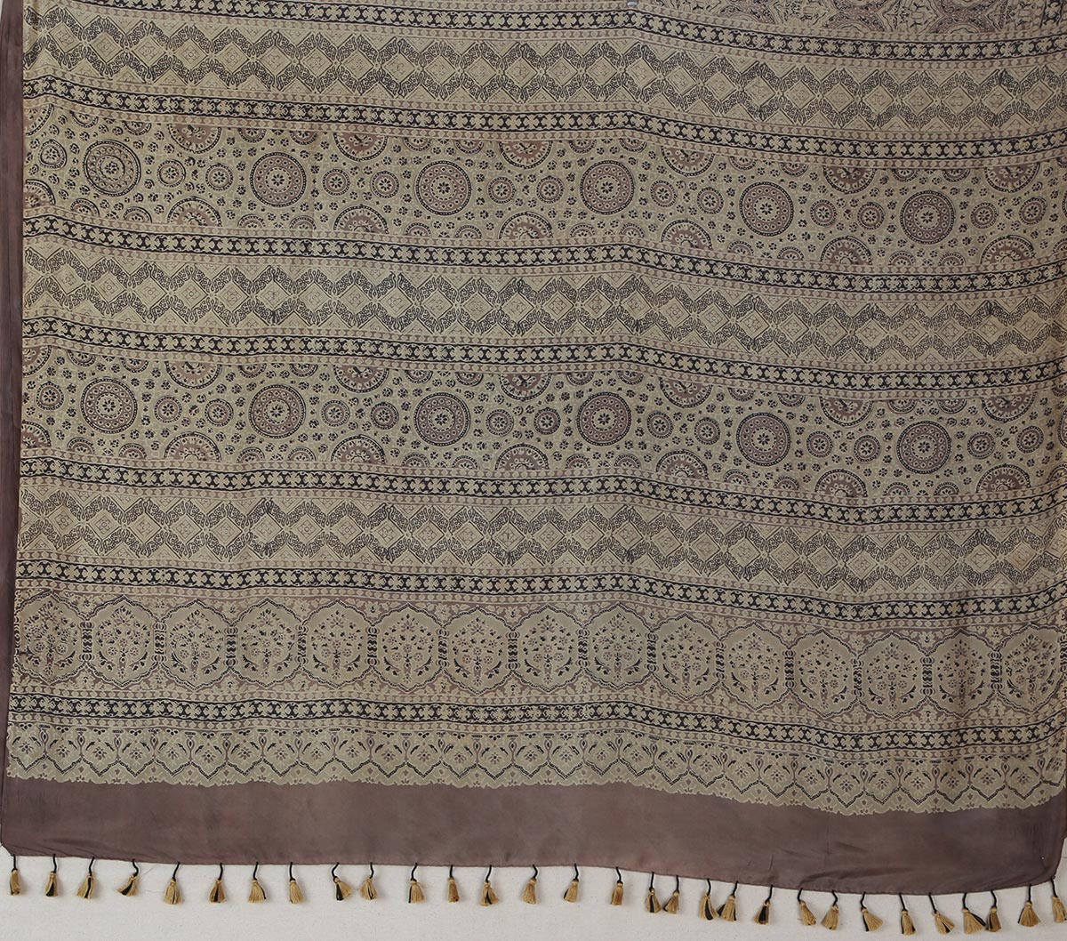 It was worn by men of the Maldhari (cattle rearing / animal husbandry) communities of the region – Jat, Node, Dhingraja, Halepotra, Mutwa, Bhambhia, Sumra and Kurar. For the women, specific motifs were printed – for older women jimardhis and dhamburas; for the younger women hairdo badshah pasand, and limai for the widows. Earlier lungis and safas were printed in two parts (traditional handlooms were of narrow widths) and these two parts were hand stitched together, with different communities using different embroidery stitches to sew together the parts. Even today the Maldharis buy it as two pieces and sew it together. Currently the product range includes yardage for garments, bed sheets, table covers, sarees and dupattas.